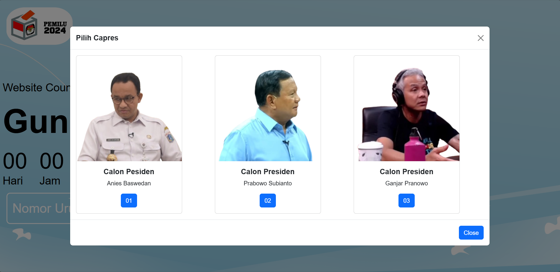 Website countdown pemilu 2024 dibuat menggunakan HTML, CSS, dan JavaScript. Website ini menampilkan hitung mundur untuk menunjukan waktu pemilihan umum atau pemilihan presiden pada tahun 2024, serta manmpilkan nomor urut calon presiden.