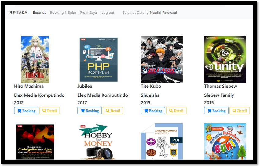 Website ini dibuat dengan menggunakan framework CodeIgniter. Website ini berguna untuk peminjaman buku secara online. Website ini juga menampilkan fitur booking, checkout, dan detail buku. Website ini dapat digunakan sebagai admin dan user, dimana admin dapat menambah stok buku, Melihat jumlah buku yang dibooking dan dipinjam.
