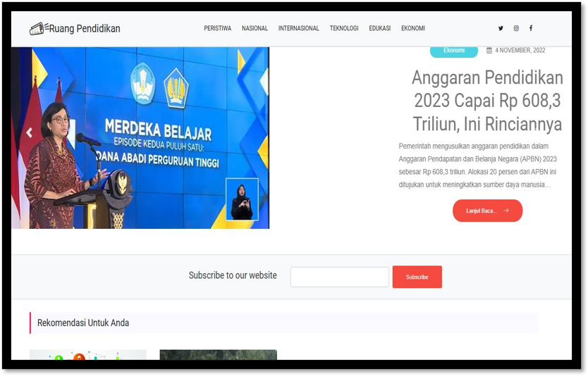Website ini menampilkan informasi/berita tentang pendidikan di Indonesia. Website ini juga menampilkan fitur berita dengan berbagai peristiwa dari nasional sampai internasional. Website ini dapat digunakan sebagai admin dan user, dimana admin dapat mengupdate tayangan berita dan menghapus berita.