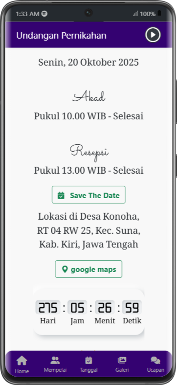Website undangan pernikahan online ini dibuat menggunakan HTML, CSS, dan JavaScript untuk memberikan pengalaman interaktif dan elegan bagi para tamu undangan. Dengan desain responsif, website ini menampilkan informasi pernikahan seperti tanggal, lokasi, galeri foto, Love gift, Konfirmasi kehadiran, serta hitungan mundur menuju hari spesial. Animasi ringan dan efek transisi membuat tampilan lebih menarik.